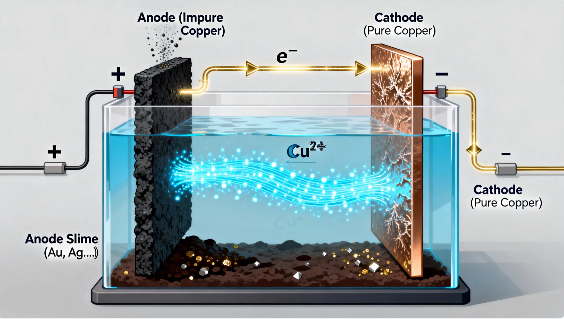 You’ve got a large tank filled with a copper sulfate solution, almost like a little swimming pool. Hang a dirty, thick copper plate (the anode) on one side and a bright, thin pure copper sheet (the cathode) on the other.
