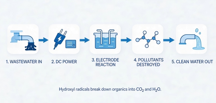 Electrocatalytic wastewater treatment, to put it simply, is a method that utilizes electricity to create something powerful in water to eliminate pollutants.